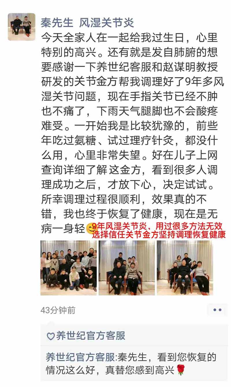 老师你好!我又介绍了3个老人(姓王,姓杨,姓邓的)来用关节肽不知道她们来没有?因我儿子出院了,现在回家恢复,我既高兴又很忙(买菜做饭等),我还要感谢你们的爱心帮助,儿子出院了,我的脚也好了,能出去买菜等采购了。出去时碰到知道我以前脚痛的朋友,经常问我怎么好的,我就高兴地告诉他们是用关节肽调理好的,他们听得很认真,有的也想试试,以后肯定陆续有人来问的,我一定把关节肽传给他们,解除他们的痛苦,共享科学发达之福。